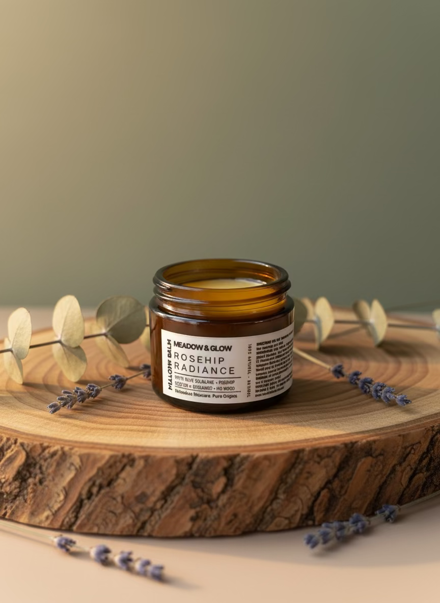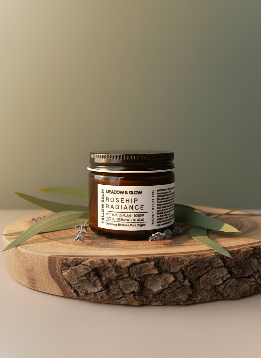 Rosehip Radiance is a deeply nourishing tallow face balm crafted to soften, replenish, and support a natural, healthy-looking glow. Made with pasture-raised, antibiotic & hormone-free Ontario beef tallow, rosehip seed oil, olive squalane, and ultra-refined shea, this silky balm melts into the skin to comfort dryness and restore softness — without feeling heavy or greasy.