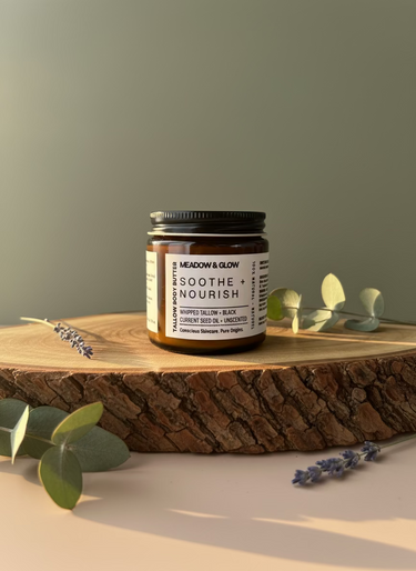 Soothe & Nourish is your ultra-gentle, fragrance-free moisturizer designed for dry and sensitive skin. Made with pasture-raised, antibiotic & hormone-free Ontario beef tallow, olive oil, and black currant seed oil, this rich butter supports the skin’s moisture barrier and helps soften the feeling of dryness and discomfort — without essential oils.